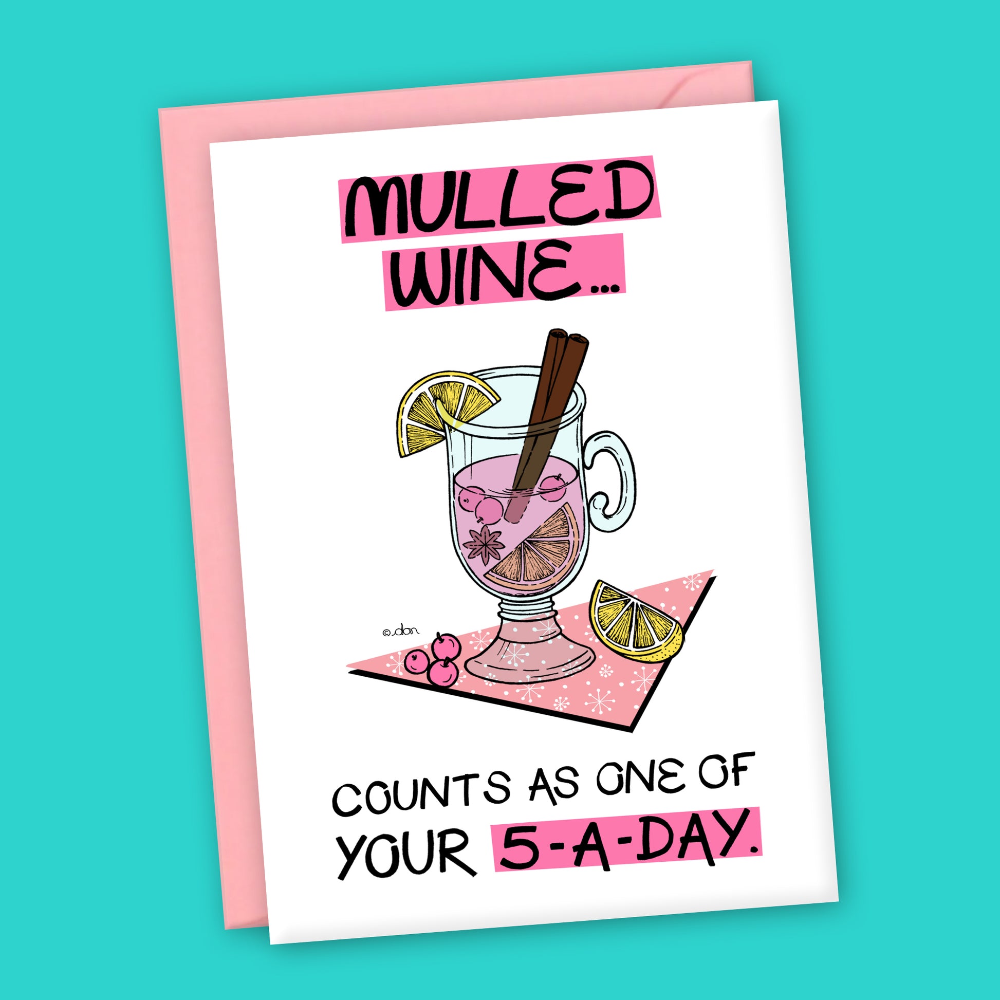 Capture the cosiness of Christmas and spread some festive joy with our funny 'Mulled Wine' Christmas card. This design has been printed to a high quality on recycled card and features a hand-drawn illustration of a delicious looking glass of mulled wine the laugh out loud message, ‘Counts as one of your 5-a-day.'